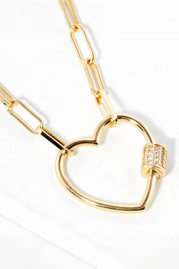 Necklace Size : 17.5" L Pendant Size : 0.8" X 0.8" Elegant paperclip chain necklace featuring a heart-shaped lock pendant with sparkling accents. A chic and versatile accessory that blends romance and modern design, perfect for layering or wearing solo. Lead and Nickel Compliant Made In Korea Gold Dipped CZ Cubic Zirconia Gold Dipped CZ Stone Paved Open Heart Carabiner Pendant Paperclip Chain Necklace White Gold Dipped CZ Stone Paved Open Heart Carabiner Pendant Paperclip Chain Necklace